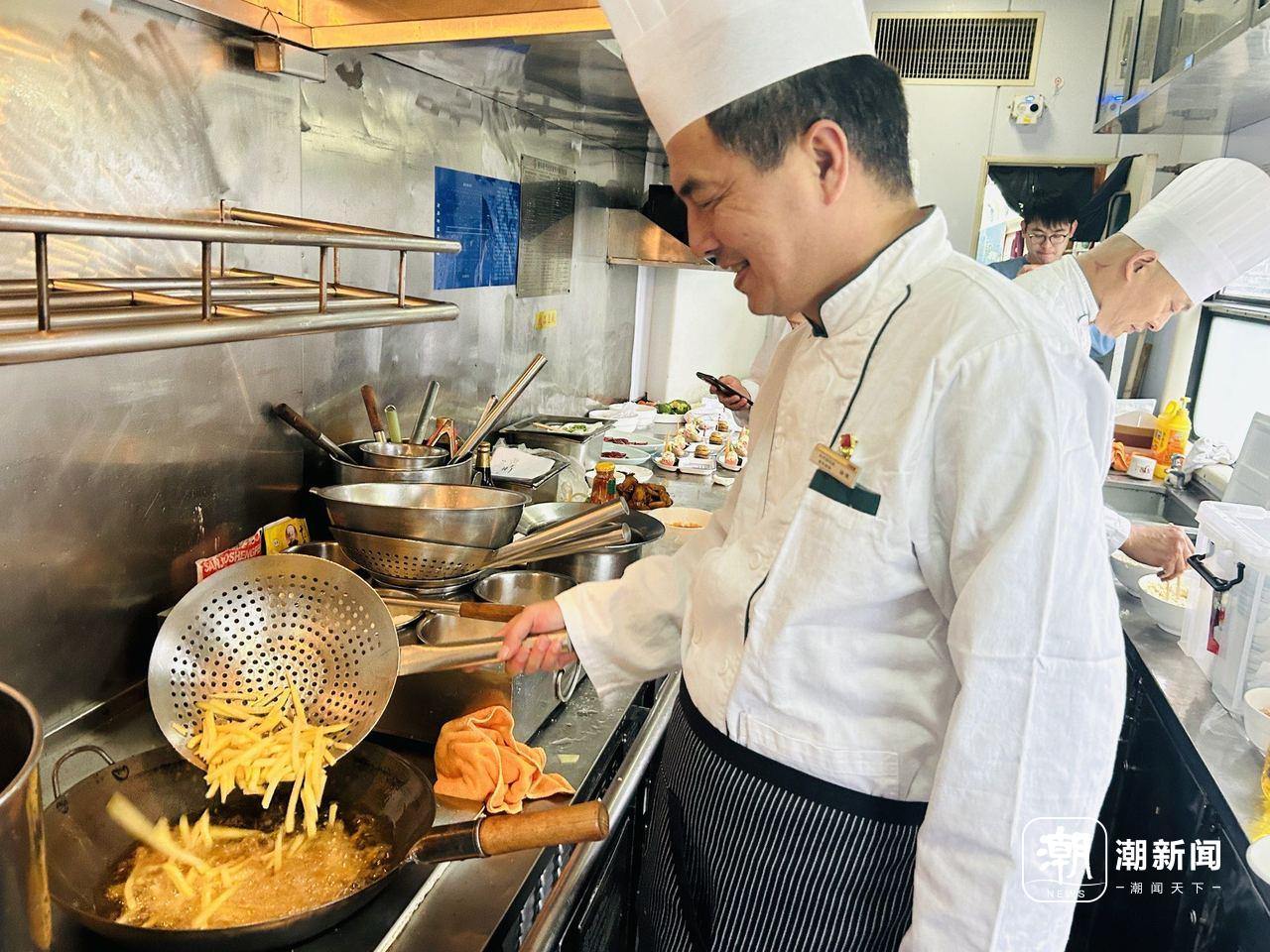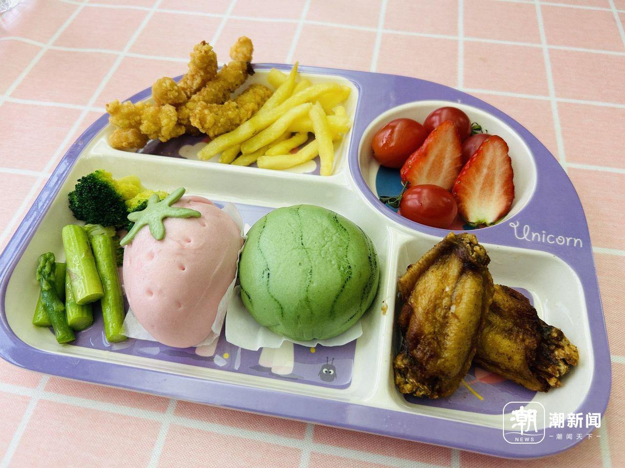 潮新闻记者在现场看到,餐车上的餐食都是厨师在后厨现场加工烹饪。一份售价25元的儿童套餐,包含孩子们喜欢的薯条、鸡米花以及两个鸡翅,还搭配了蔬菜和水果,主食是两个可爱的豆沙包。